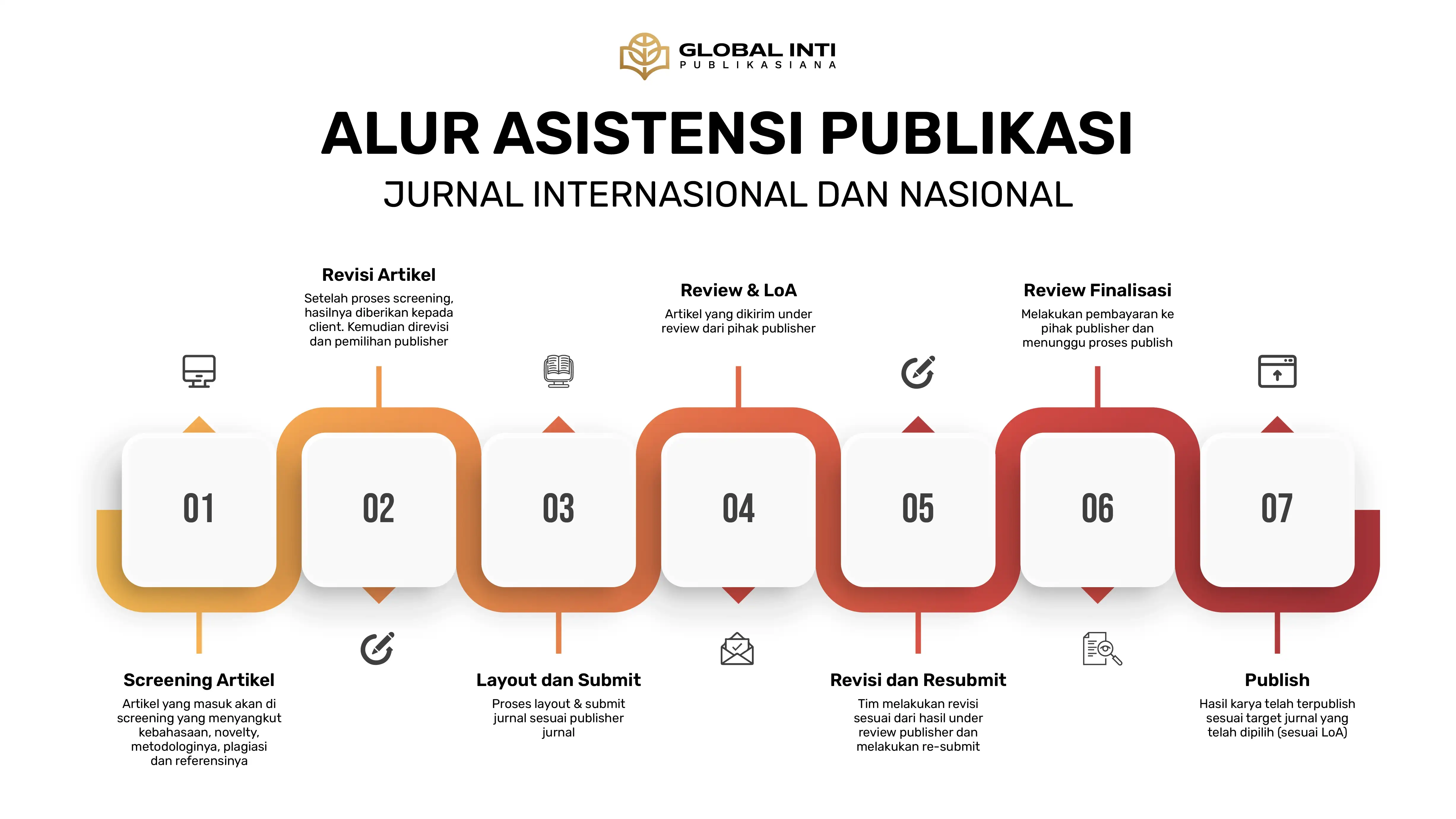 Proses Manajemen Publikasi dilakukan oleh tim professional dengan 11 tahapan mulai dari Screening naskah, Plagiarism Checker, Submit Naskah, Review Naskah, LoA, Naskah Editing, Naskah Revisi, Copy Editing, Publish, Sertifikat Licence dan Full Issue.